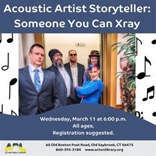 Acoustic Artists Storyteller Series at Acton Library is back! Stories and songs paired with pics and visuals. Each artist will bring something uniquely special to the experience. This month, Someone You Can Xray: The Making of an Independent Album.